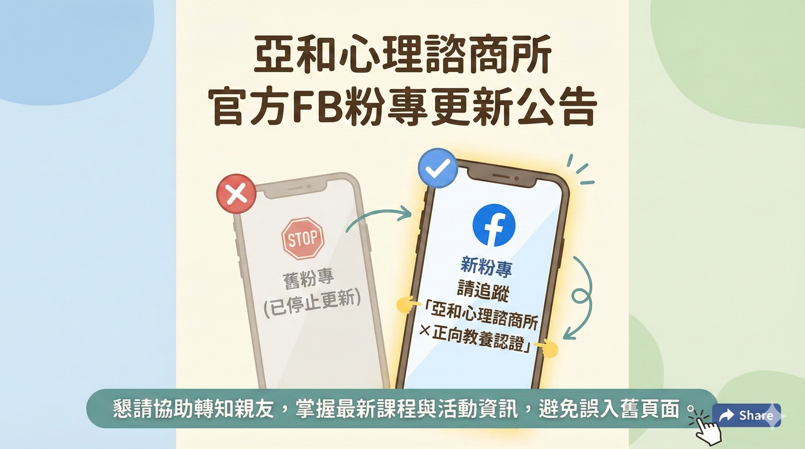 2026-01-27【重大通知】亞和心理諮商所 Facebook 粉專更新通知